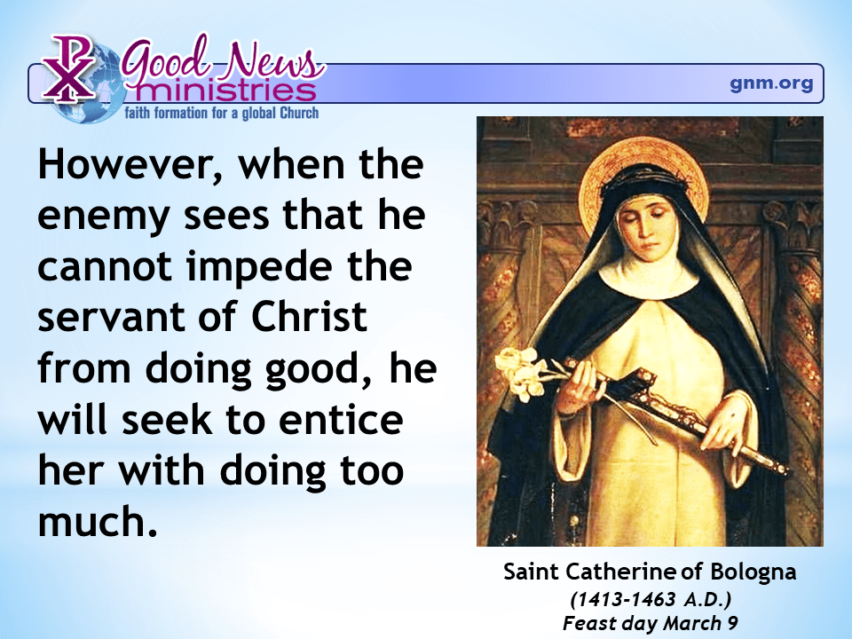 However, when the enemy sees that he cannot impede the servant of Christ from doing good, he will seek to entice her with doing too much. (1413-1463 A.D.) Poor Claire Superior. Feast day March 9