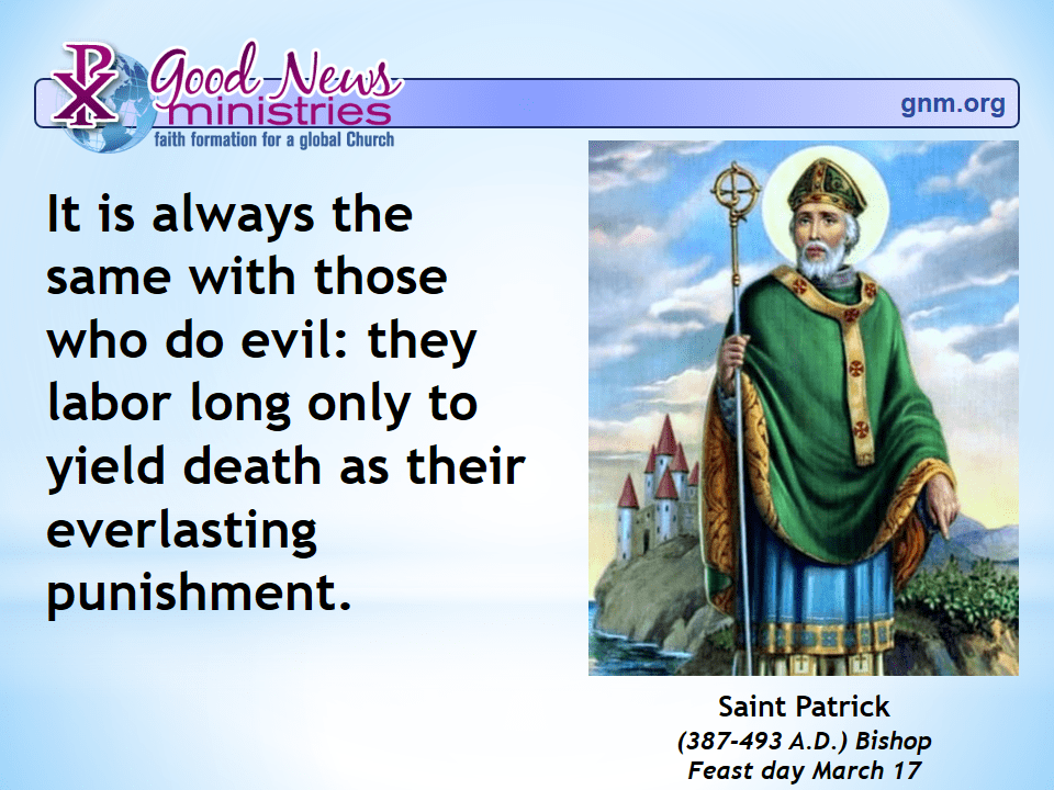 It is always the same with those who do evil: they labor long only to yield death as their everlasting punishment. (387-493 A.D.) Bishop. Feast day March 17