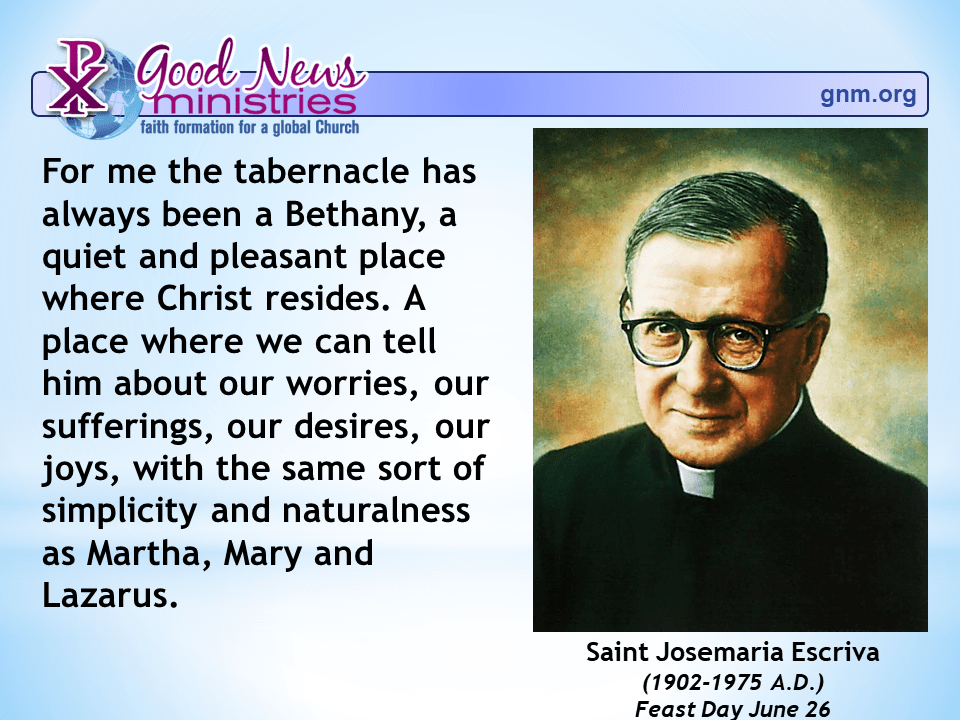 For me the tabernacle has always been a Bethany, a quiet and pleasant place where Christ resides. A place where we can tell him about our worries, our sufferings, our desires, our joys, with the […] Read More