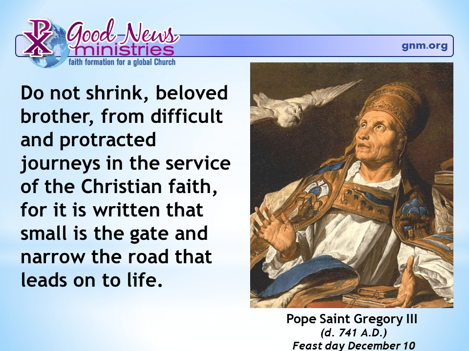 Do not shrink, beloved brother, from difficult and protracted journeys in the service of the Christian faith, for it is written that small is the gate and narrow the road that leads on to life.