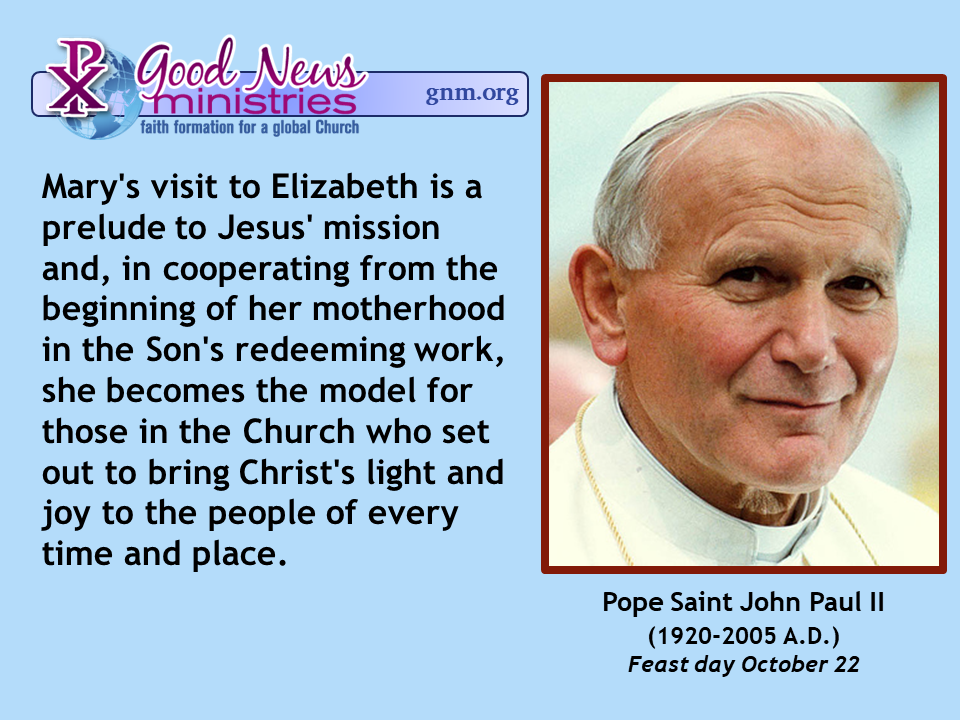 Mary’s visit to Elizabeth is a prelude to Jesus’ mission and, in cooperating from the beginning of her motherhood in the Son’s redeeming work, she becomes the model for those in the Church who set […] Read More