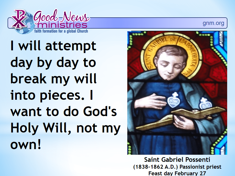 I will attempt day by day to break my will into pieces. I want to do God’s Holy Will, not my own! (1838-1862 A.D.) Passionist priest. Feast day February 27