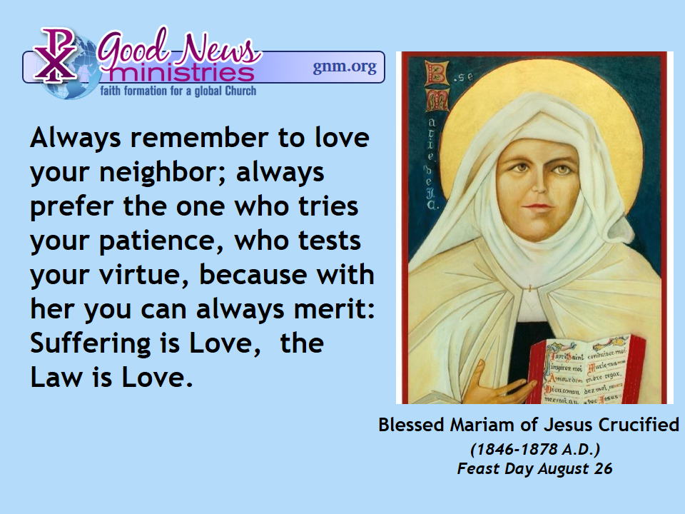 Always remember to love your neighbor; always prefer the one who tries your patience, who tests your virtue, because with her you can always merit: Suffering is Love, the Law is Love.