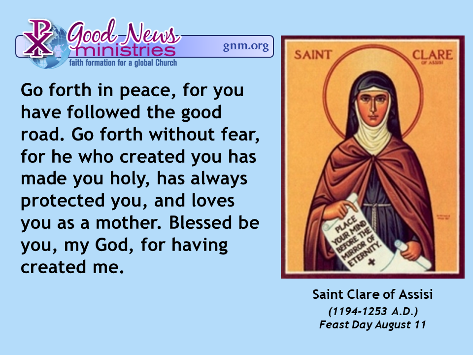 Go forth in peace, for you have followed the good road. Go forth without fear, for he who created you has made you holy, has always protected you, and loves you as a mother. Blessed […] Read More