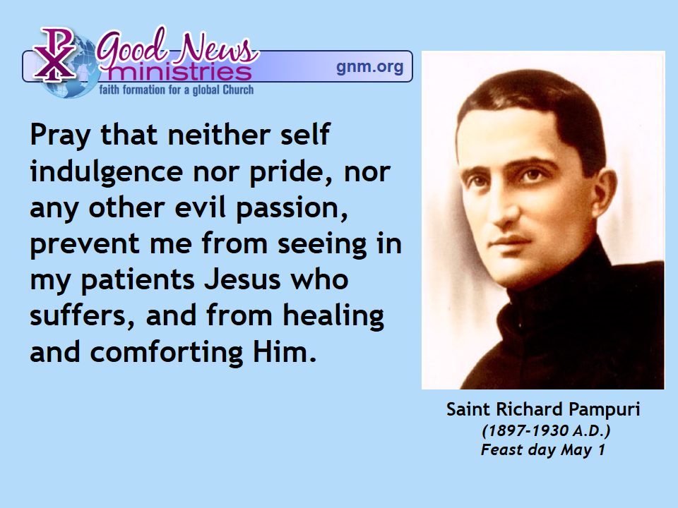Pray that neither self indulgence nor pride, nor any other evil passion, prevent me from seeing in my patients Jesus who suffers, and from healing and comforting Him.