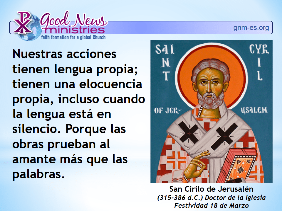 Nuestras acciones tienen lengua propia; tienen una elocuencia propia, incluso cuando la lengua está en silencio. Porque las obras prueban al amante más que las palabras. (315-386) Doctor de la Iglesia. Festividad 18 de Marzo