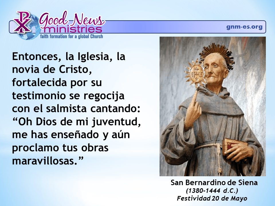 Entonces, la Iglesia, la novia de Cristo, fortalecida por su testimonio se regocija con el salmista cantando: “Oh Dios de mi juventud, me has enseñado y aún proclamo tus obras maravillosas.”